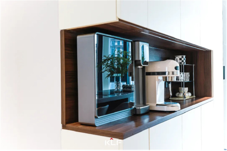 一侧到顶餐边柜结合开放格造型,以芬兰白+烟熏橡木打造温馨空间。定制柜体能够隐藏好所有电线的同时可以根据家电预留置物区域,适合注重生活品质的家人。