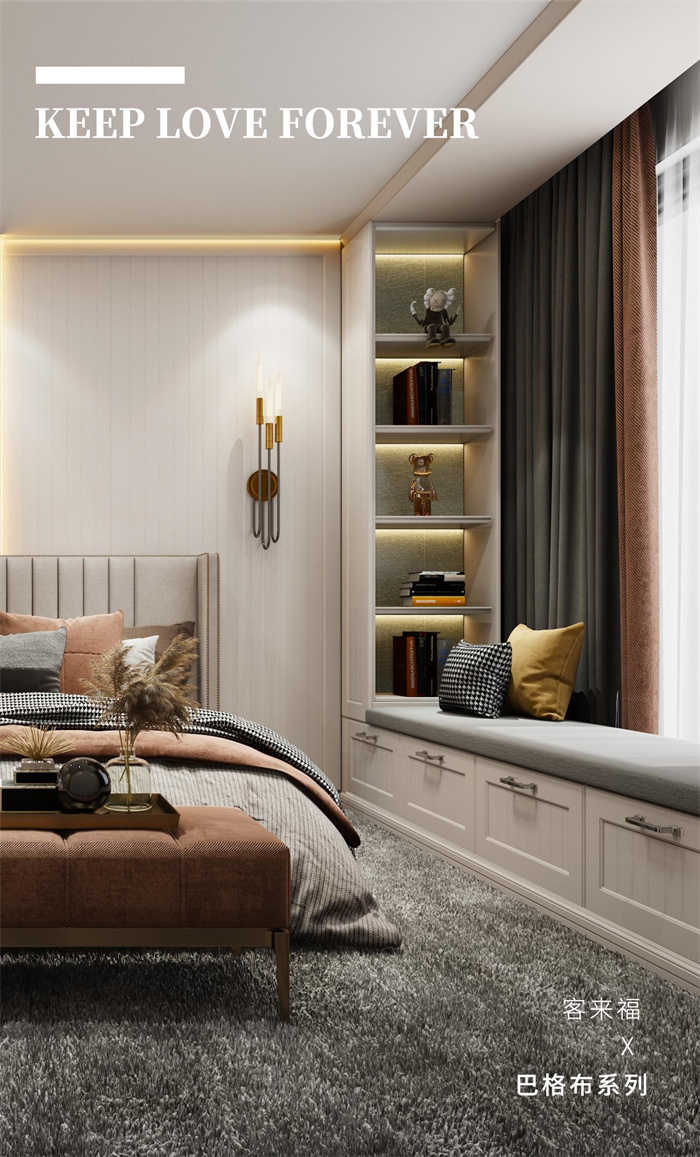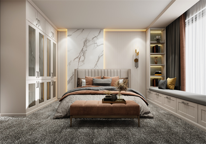 卧室的栅格背景墙和模压护墙,做出了⾼定混油的产品效果,超晶板和岩板等超现代感的元素的融入, 更是将简欧这⼀经典风格产品做了颠覆,更符合当下消费⼈群让客户生活更加自然。