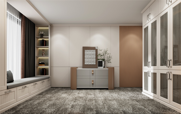 卧室玻璃应用于衣柜,正成为引领潮流的设计风向,同时也是打造⾼级感衣橱的利器。将玻璃与金属的结合,通透清亮,使得空间美感被放⼤。