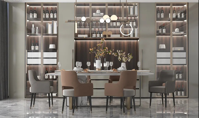 餐边柜酒柜的组合设计,增加实用性的同时也带来了丰富的层次感与趣味性。线条流畅、清晰,金属与灯光碰撞出精彩的火花,简约而精致的设计感,在现代造型中显得十分高贵。
