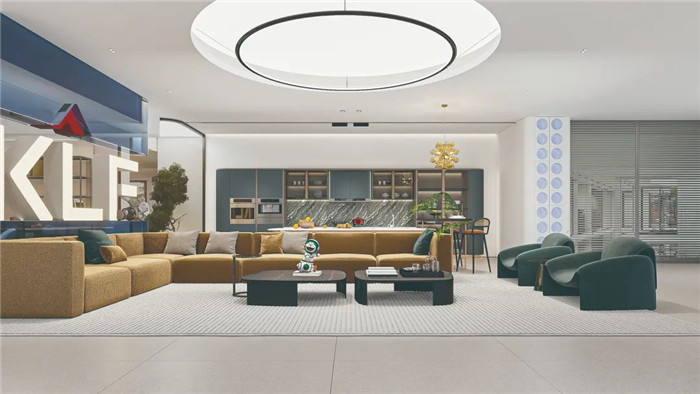 客厅采用蓝色亚克力渐变设计,同时做了品牌Logo的结合,既作为隔断之用,也承载着品牌IP和视觉的传达。