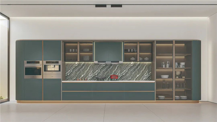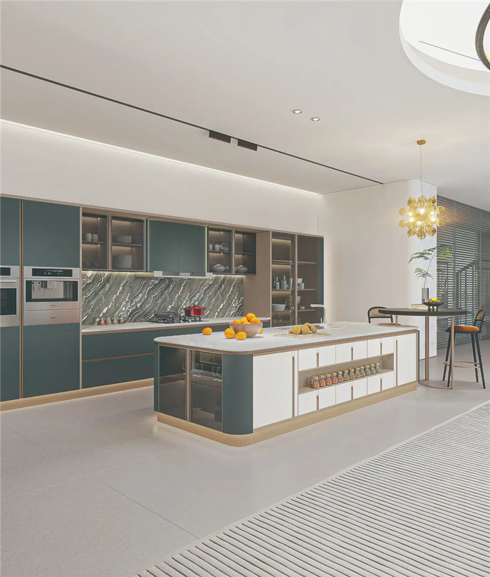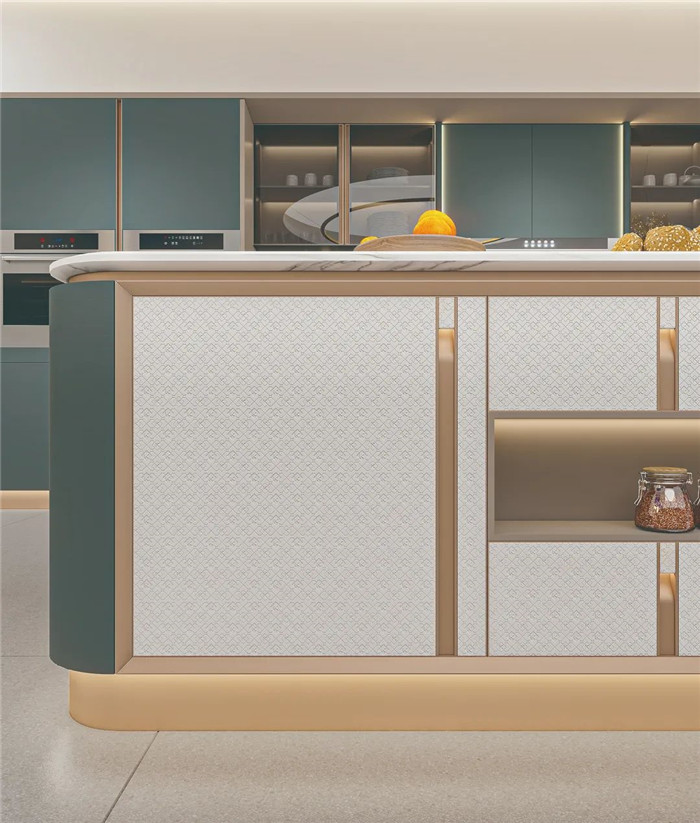 采用圆弧包边设计,将圆弧贯穿整套产品,勾勒温润柔和质感。免拉手灯柱和铝合金灯带,尽显高贵与优雅。既富有意式侘寂的设计风尚,也是对今年高定流行元素的创新性结合。