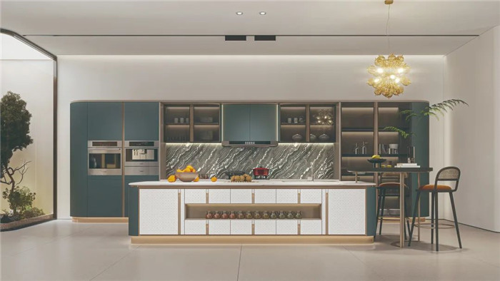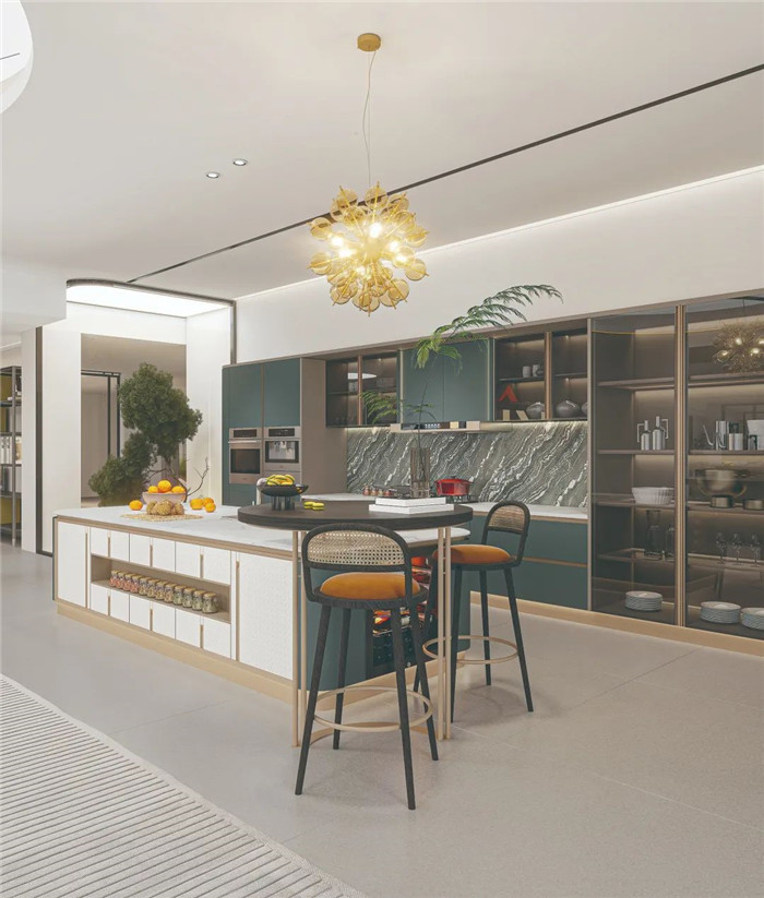 作为社交型厨房的核心区域——岛台的设置,既满足了日常的备餐功能,也是对社交功能的拓宽。从烹饪场所升级到社交场所,空间的连接,亦是情感的桥梁,升华家的温度,丰盈家的想象。