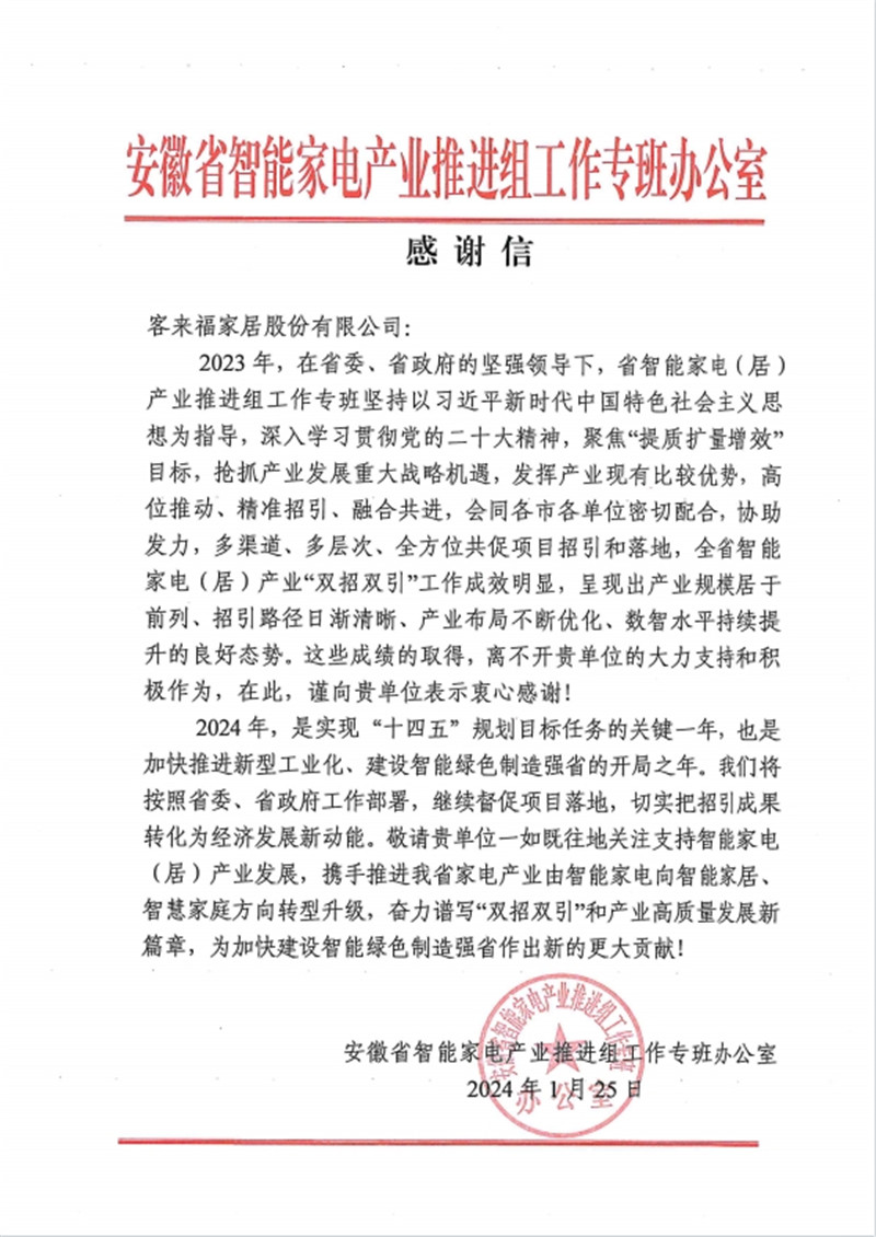 安徽省智能家电产业链推进组工作专班办公室感谢星空(中国)xingkong家居助力智能家电(居)产业发展