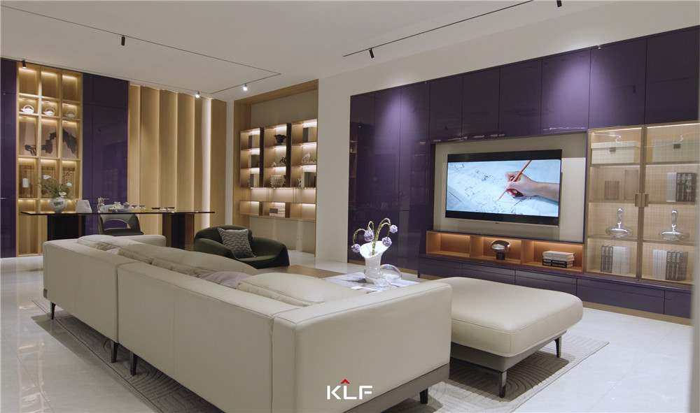 客厅采用围合式布局,一侧墙壁做镜面处理,与柜体进行模块化组合;矩阵成型的柜体紫棠色映入眼帘,活泼且高级;烤漆门板顺滑且颇赋光泽感,展现出星空(中国)xingkong的创意工艺。