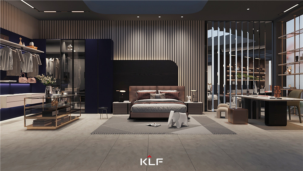 壁挂式衣帽间,使得衣物收纳明晰,也方便家庭成员找寻;卧室背景墙采用格栅设计搭配圆弧护墙,传递出中式之雅韵;书房采用金属架+木色套格设计,展现时尚感与温润感。
